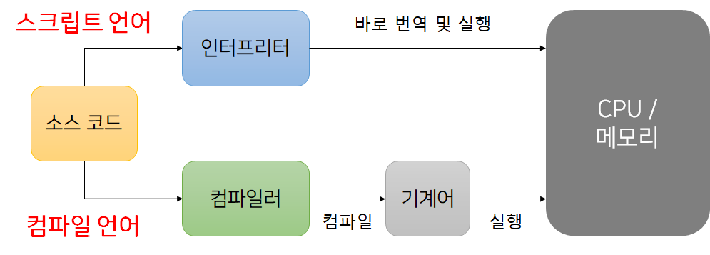 컴파일 언어와 인터프리트 언어는 프로그래밍 언어를 실행하는 방식이 다르다.